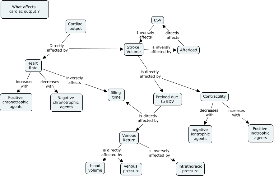 This Concept Map, created with IHMC CmapTools, has information related to: -Winkel tutorial, Contractility decreases with negative iontrophic agents, Stroke Volume is directly affected by Preload due to EDV, Venous Return is directly affected by venous pressure, Stroke Volume is inversly affected by Afterload, Preload due to EDV is directly affected by filling time, Heart Rate inversely affects filling time, Venous Return is directly affected by blood volume, Venous Return is inversely affected by intrathoracic pressure, Preload due to EDV is directly affected by Venous Return, ESV Inversely affects Stroke Volume, Heart Rate increases with Positive chronotrophic agents, Stroke Volume is directly affected by Contractility, Cardiac output Directly affected by Stroke Volume, Contractility increases with Positive inotrophic agents, Cardiac output Directly affected by Heart Rate, Afterload directly affects ESV, Heart Rate decreases with Negative chronotrophic agents