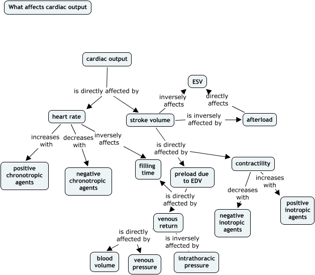 This Concept Map, created with IHMC CmapTools, has information related to: PayalKhinchaTutorial, heart rate inversely affects filling time, afterload directly affects ESV, stroke volume inversely affects ESV, heart rate increases with positive chronotropic agents, preload due to EDV is directly affected by filling time, cardiac output is directly affected by stroke volume, contractility decreases with negative inotropic agents, venous return is directly affected by blood volume, contractility increases with positive inotropic agents, stroke volume is directly affected by contractility, stroke volume is directly affected by preload due to EDV, cardiac output is directly affected by heart rate, preload due to EDV is directly affected by venous return, stroke volume is inversely affected by afterload, venous return is inversely affected by intrathoracic pressure, venous return is directly affected by venous pressure, heart rate decreases with negative chronotropic agents