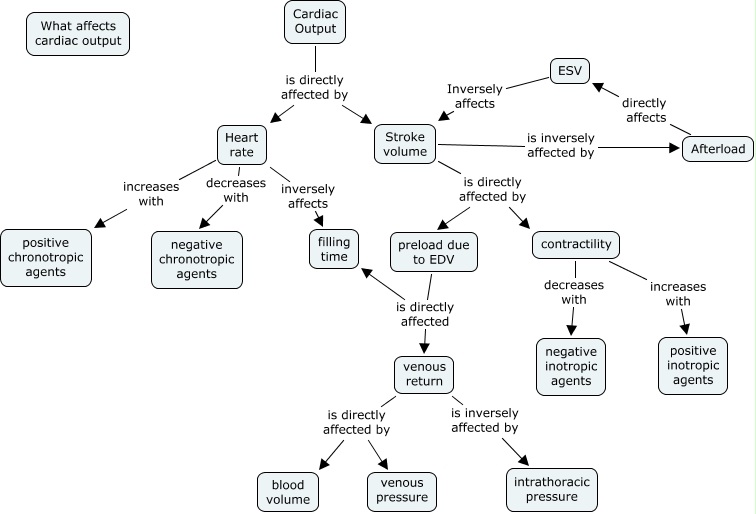 This Concept Map, created with IHMC CmapTools, has information related to: cardiac output, Afterload directly affects ESV, contractility increases with positive inotropic agents, Stroke volume is inversely affected by Afterload, venous return is directly affected by blood volume, contractility decreases with negative inotropic agents, Heart rate inversely affects filling time, Cardiac Output is directly affected by Stroke volume, Stroke volume is directly affected by preload due to EDV, Heart rate increases with positive chronotropic agents, preload due to EDV is directly affected venous return, Heart rate decreases with negative chronotropic agents, preload due to EDV is directly affected filling time, Cardiac Output is directly affected by Heart rate, Stroke volume is directly affected by contractility, venous return is directly affected by venous pressure, venous return is inversely affected by intrathoracic pressure, ESV Inversely affects Stroke volume