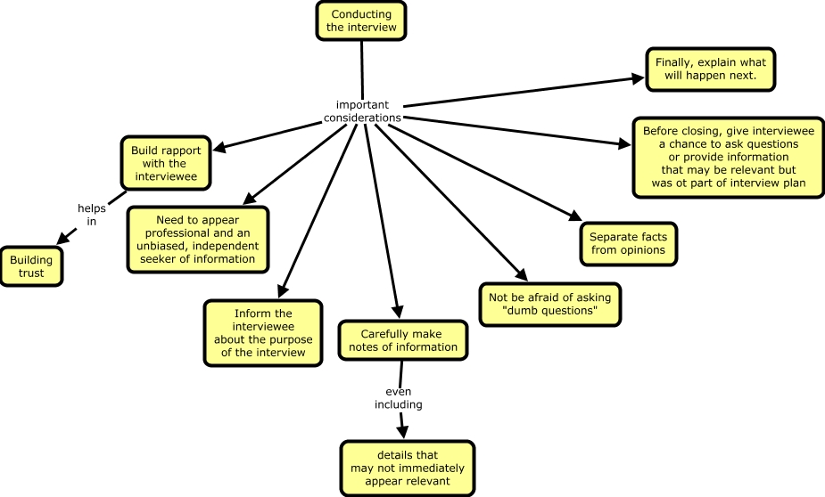 This Concept Map, created with IHMC CmapTools, has information related to: Conducting the interview, Carefully make notes of information even including details that may not immediately appear relevant, Conducting the interview important considerations Carefully make notes of information, Conducting the interview important considerations Before closing, give interviewee a chance to ask questions or provide information that may be relevant but was ot part of interview plan, Conducting the interview important considerations Separate facts from opinions, Build rapport with the interviewee helps in Building trust, Conducting the interview important considerations Finally, explain what will happen next., Conducting the interview important considerations Not be afraid of asking "dumb questions", Conducting the interview important considerations Need to appear professional and an unbiased, independent seeker of information, Conducting the interview important considerations Inform the interviewee about the purpose of the interview, Conducting the interview important considerations Build rapport with the interviewee