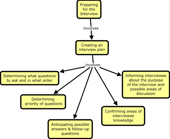 This Concept Map, created with IHMC CmapTools, has information related to: Preparing for the Interview, Creating an interview plan involves Determining priority of questions, Creating an interview plan involves Anticipating possible answers & follow-up questions, Preparing for the Interview involves Creating an interview plan, Creating an interview plan involves Confirming areas of interviewee knowledge, Creating an interview plan involves Informing interviewee about the purpose of the interview and possible areas of discussion, Creating an interview plan involves Determining what questions to ask and in what order