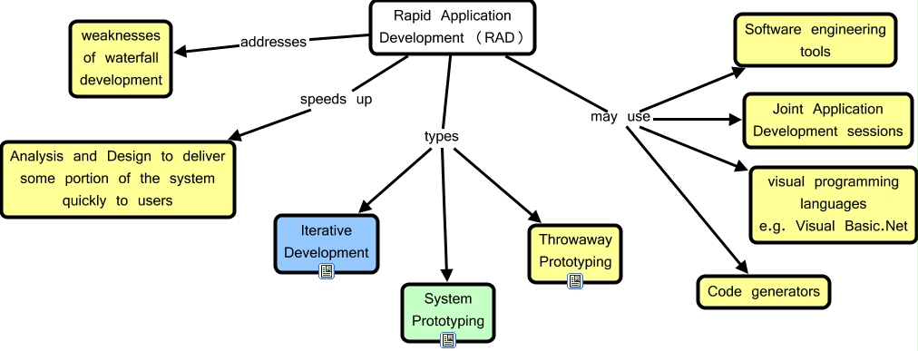 This Concept Map, created with IHMC CmapTools, has information related to: Rapid Application Development, Rapid Application Development (RAD) types Iterative Development, Rapid Application Development (RAD) types System Prototyping, Rapid Application Development (RAD) may use visual programming languages e.g. Visual Basic.Net, Rapid Application Development (RAD) may use Code generators, Rapid Application Development (RAD) may use Joint Application Development sessions, Rapid Application Development (RAD) may use Software engineering tools, Rapid Application Development (RAD) speeds up Analysis and Design to deliver some portion of the system quickly to users, Rapid Application Development (RAD) types Throwaway Prototyping, Rapid Application Development (RAD) addresses weaknesses of waterfall development