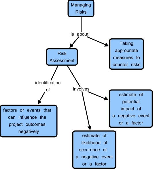 This Concept Map, created with IHMC CmapTools, has information related to: Managing Risks, Risk Assessment involves estimate of potential impact of a negative event or a factor, Managing Risks is about Taking appropriate measures to counter risks, Risk Assessment identification of factors or events that can influence the project outcomes negatively, Managing Risks is about Risk Assessment, Risk Assessment involves estimate of likelihood of occurence of a negative event or a factor