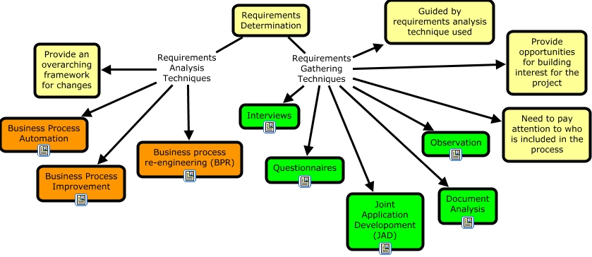 This Concept Map, created with IHMC CmapTools, has information related to: Techniques for requirements determination, Requirements Determination Requirements Gathering Techniques Interviews, Requirements Determination Requirements Gathering Techniques Joint Application Developoment (JAD), Requirements Determination Requirements Analysis Techniques Business Process Improvement, Requirements Determination Requirements Gathering Techniques Guided by requirements analysis technique used, Requirements Determination Requirements Analysis Techniques Provide an overarching framework for changes, Requirements Determination Requirements Gathering Techniques Observation, Requirements Determination Requirements Gathering Techniques Document Analysis, Requirements Determination Requirements Gathering Techniques Questionnaires, Requirements Determination Requirements Gathering Techniques Provide opportunities for building interest for the project, Requirements Determination Requirements Gathering Techniques Need to pay attention to who is included in the process, Requirements Determination Requirements Analysis Techniques Business Process Automation, Requirements Determination Requirements Analysis Techniques Business process re-engineering (BPR)