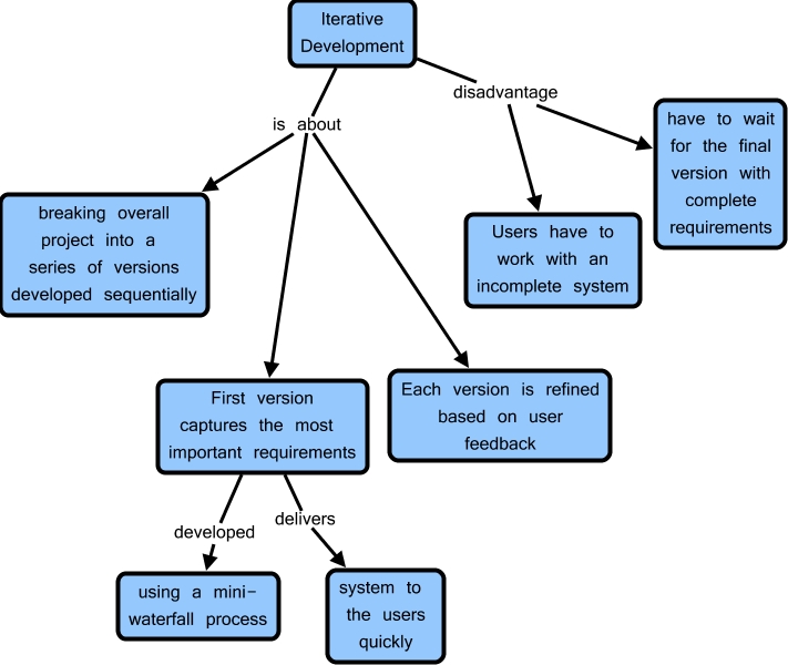 This Concept Map, created with IHMC CmapTools, has information related to: Iterative Development, Iterative Development disadvantage have to wait for the final version with complete requirements, First version captures the most important requirements delivers system to the users quickly, Iterative Development is about breaking overall project into a series of versions developed sequentially, Iterative Development is about First version captures the most important requirements, First version captures the most important requirements developed using a mini- waterfall process, Iterative Development disadvantage Users have to work with an incomplete system, Iterative Development is about Each version is refined based on user feedback