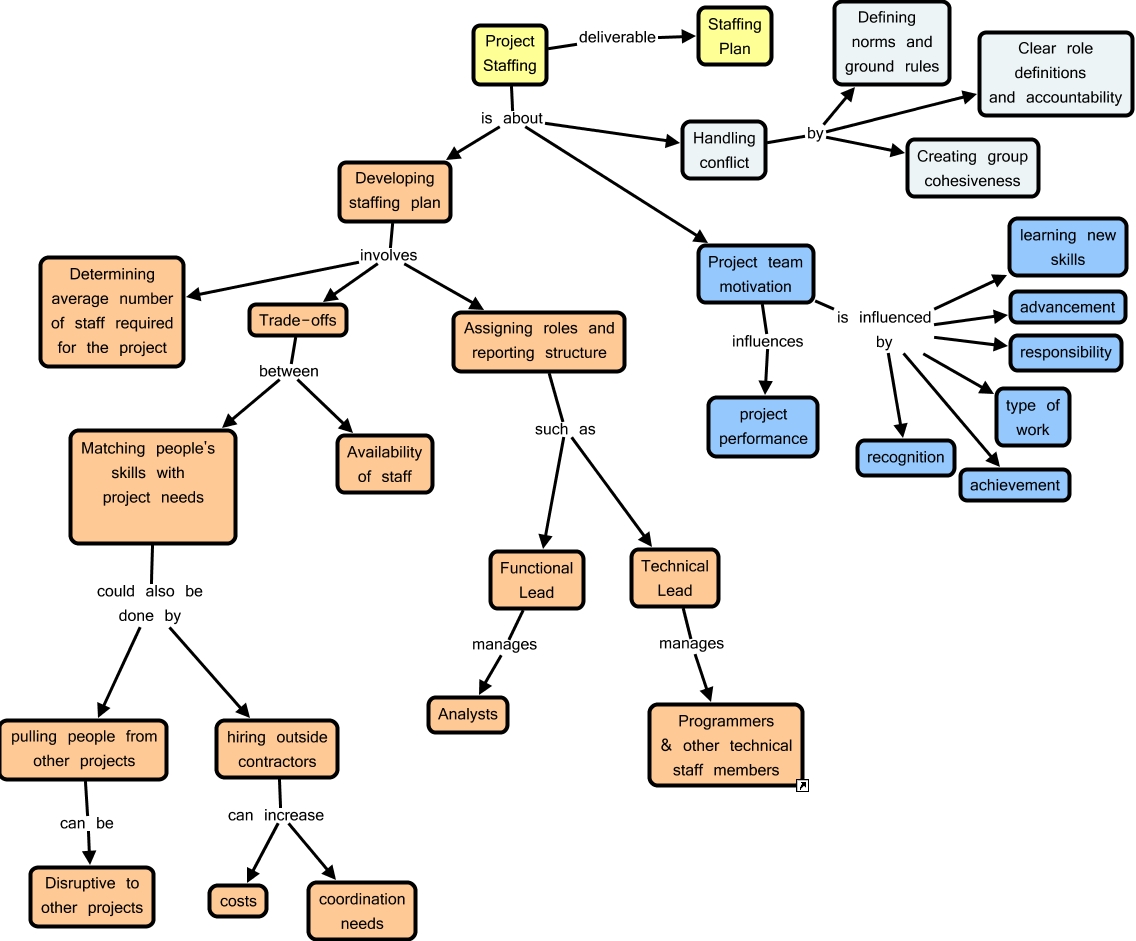 This Concept Map, created with IHMC CmapTools, has information related to: Project Staffing, Project team motivation is influenced by responsibility, Project team motivation is influenced by advancement, Project team motivation is influenced by recognition, Matching people's skills with project needs could also be done by pulling people from other projects, Trade-offs between Matching people's skills with project needs, Project Staffing is about Handling conflict, Handling conflict by Defining norms and ground rules, pulling people from other projects can be Disruptive to other projects, Developing staffing plan involves Assigning roles and reporting structure, Matching people's skills with project needs could also be done by hiring outside contractors, Project team motivation influences project performance, Handling conflict by Creating group cohesiveness, Project Staffing is about Developing staffing plan, Assigning roles and reporting structure such as Technical Lead, Project team motivation is influenced by type of work, Project team motivation is influenced by achievement, Technical Lead manages Programmers & other technical staff members, Project team motivation is influenced by learning new skills, hiring outside contractors can increase coordination needs, Developing staffing plan involves Trade-offs