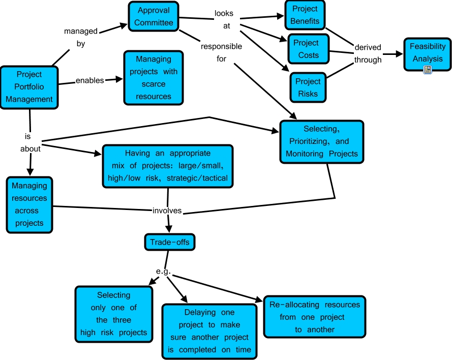 This Concept Map, created with IHMC CmapTools, has information related to: Project Portfolio Management, Project Benefits derived through Feasibility Analysis, Project Portfolio Management is about Having an appropriate mix of projects: large/small, high/low risk, strategic/tactical, Project Portfolio Management enables Managing projects with scarce resources, Project Costs derived through Feasibility Analysis, Trade-offs e.g. Selecting only one of the three high risk projects, Trade-offs e.g. Re-allocating resources from one project to another, Approval Committee looks at Project Benefits, Project Portfolio Management managed by Approval Committee, Having an appropriate mix of projects: large/small, high/low risk, strategic/tactical involves Trade-offs, Project Risks derived through Feasibility Analysis, Managing resources across projects involves Trade-offs, Approval Committee looks at Project Costs, Project Portfolio Management is about Managing resources across projects, Trade-offs e.g. Delaying one project to make sure another project is completed on time, Project Portfolio Management is about Selecting, Prioritizing, and Monitoring Projects, Approval Committee responsible for Selecting, Prioritizing, and Monitoring Projects, Approval Committee looks at Project Risks, Selecting, Prioritizing, and Monitoring Projects involves Trade-offs