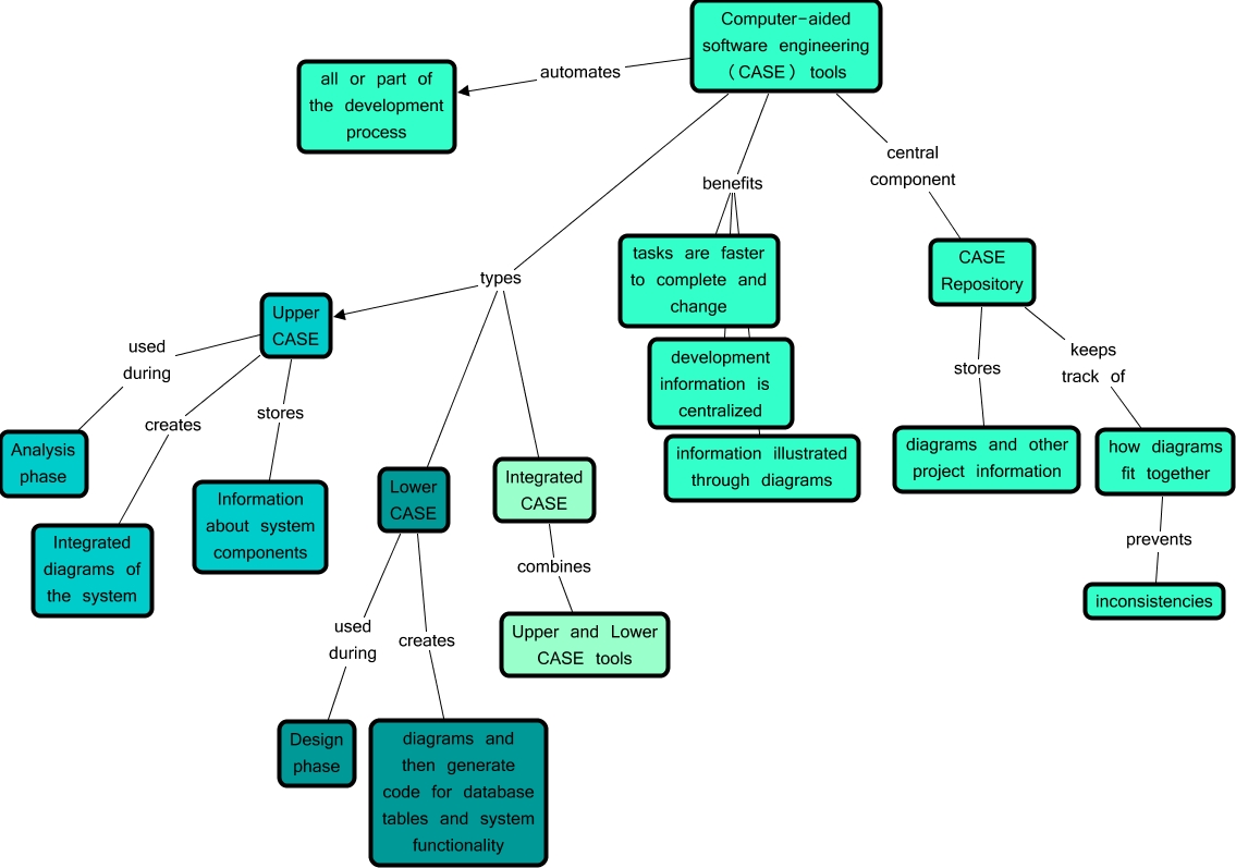 This Concept Map, created with IHMC CmapTools, has information related to: CASE Tools, Upper CASE used during Analysis phase, Integrated CASE combines Upper and Lower CASE tools, Lower CASE used during Design phase, Computer-aided software engineering (CASE) tools types Upper CASE, Computer-aided software engineering (CASE) tools benefits information illustrated through diagrams, CASE Repository stores diagrams and other project information, Computer-aided software engineering (CASE) tools types Integrated CASE, Upper CASE stores Information about system components, Computer-aided software engineering (CASE) tools automates all or part of the development process, Upper CASE creates Integrated diagrams of the system, how diagrams fit together prevents inconsistencies, CASE Repository keeps track of how diagrams fit together, Computer-aided software engineering (CASE) tools benefits tasks are faster to complete and change, Computer-aided software engineering (CASE) tools central component CASE Repository, Computer-aided software engineering (CASE) tools types Lower CASE, Lower CASE creates diagrams and then generate code for database tables and system functionality, Computer-aided software engineering (CASE) tools benefits development information is centralized