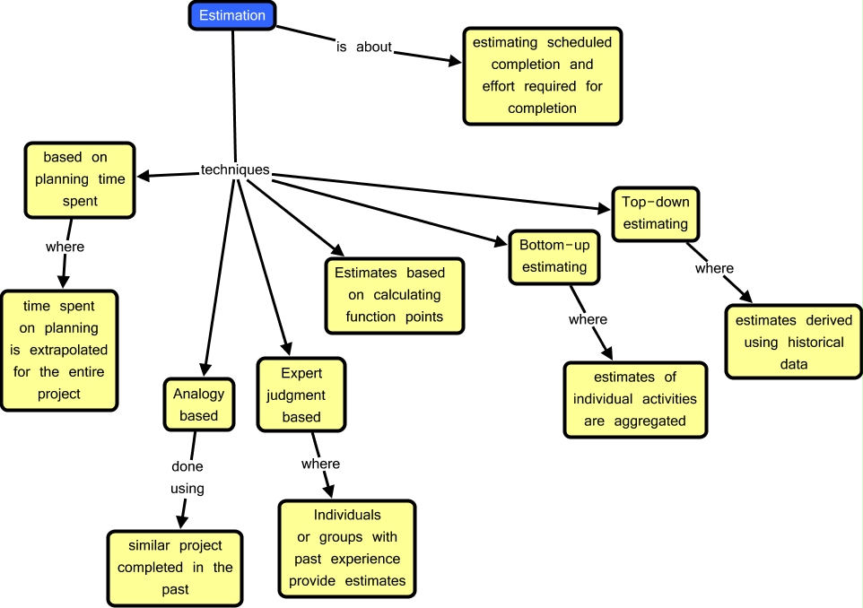 This Concept Map, created with IHMC CmapTools, has information related to: Estimation, Estimation techniques Top-down estimating, Estimation techniques Estimates based on calculating function points, Estimation is about estimating scheduled completion and effort required for completion, Bottom-up estimating where estimates of individual activities are aggregated, Expert judgment based where Individuals or groups with past experience provide estimates, Estimation techniques Analogy based, Top-down estimating where estimates derived using historical data, Estimation techniques based on planning time spent, Analogy based done using similar project completed in the past, Estimation techniques Expert judgment based, Estimation techniques Bottom-up estimating, based on planning time spent where time spent on planning is extrapolated for the entire project