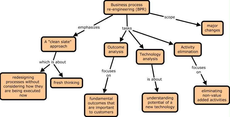 This Concept Map, created with IHMC CmapTools, has information related to: Business Process Reengineering, Business process re-engineering (BPR) emphasizes A "clean slate" approach, Business process re-engineering (BPR) tasks Activity elimination, A "clean slate" approach which is about redesigning processes without considering how they are being executed now, A "clean slate" approach which is about fresh thinking, Business process re-engineering (BPR) tasks Technology analysis, Activity elimination focuses on eliminating non-value added activities, Business process re-engineering (BPR) tasks Outcome analysis, Business process re-engineering (BPR) scope major changes, Outcome analysis focuses on fundamental outcomes that are important to customers, Technology analysis is about understanding potential of a new technology