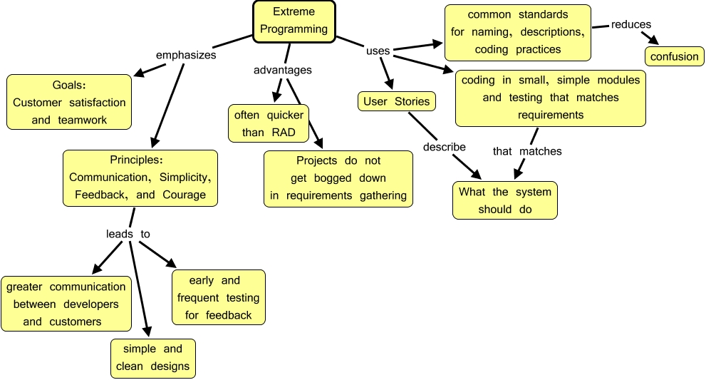 This Concept Map, created with IHMC CmapTools, has information related to: Extreme Programming, Extreme Programming advantages Projects do not get bogged down in requirements gathering, Extreme Programming uses coding in small, simple modules and testing that matches requirements, Principles: Communication, Simplicity, Feedback, and Courage leads to greater communication between developers and customers, coding in small, simple modules and testing that matches requirements that matches What the system should do, Extreme Programming emphasizes Goals: Customer satisfaction and teamwork, Extreme Programming advantages often quicker than RAD, common standards for naming, descriptions, coding practices reduces confusion, Extreme Programming emphasizes Principles: Communication, Simplicity, Feedback, and Courage, Extreme Programming uses User Stories, Principles: Communication, Simplicity, Feedback, and Courage leads to simple and clean designs, Extreme Programming uses common standards for naming, descriptions, coding practices, User Stories describe What the system should do, Principles: Communication, Simplicity, Feedback, and Courage leads to early and frequent testing for feedback