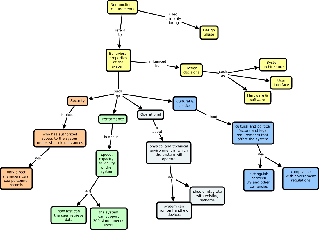 This Concept Map, created with IHMC CmapTools, has information related to: Non Functional Requirements, Behavioral properties of the system such as Operational, Behavioral properties of the system such as Performance, physical and technical environment in which the system will operate e.g. should integrate with existing systems, speed, capacity, reliability of the system e.g. the system can support 300 simultaneous users, physical and technical environment in which the system will operate e.g. system can run on handheld devices, Nonfunctional requirements refers to Behavioral properties of the system, cultural and political factors and legal requirements that affect the system e.g. distinguish between US and other currencies, speed, capacity, reliability of the system e.g. how fast can the user retrieve data, Operational is about physical and technical environment in which the system will operate, Behavioral properties of the system such as Cultural & political, Cultural & political is about cultural and political factors and legal requirements that affect the system, who has authorized access to the system under what circumstances e.g. only direct managers can see personnel records, Behavioral properties of the system influenced by Design decisions, Security is about who has authorized access to the system under what circumstances, Design decisions such as System architecture, Design decisions such as User interface, Performance is about speed, capacity, reliability of the system, Nonfunctional requirements used primarily during Design phase, Behavioral properties of the system such as Security, cultural and political factors and legal requirements that affect the system e.g. compliance with government regulations