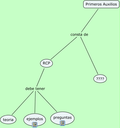 Este Cmap, tiene información relacionada con: PRIMEROS AUXILIOS EME, RCP debe tener preguntas, RCP debe tener ejemplos, Primeros Auxilios consta de RCP, Primeros Auxilios consta de ????, RCP debe tener teoria
