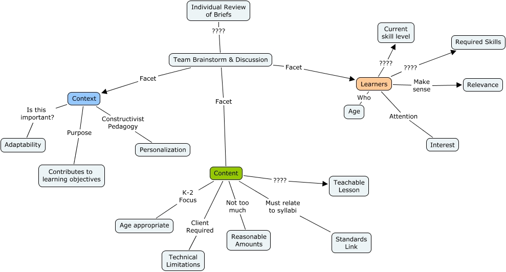This Concept Map, created with IHMC CmapTools, has information related to: Review of Briefs, Learners Attention Interest, Content Client Required Technical Limitations, Team Brainstorm & Discussion Facet Content, Team Brainstorm & Discussion Facet Learners, Learners Who Age, Content ???? Teachable Lesson, Team Brainstorm & Discussion Facet Context, Learners ???? Current skill level, Content Must relate to syllabi Standards Link, Content Not too much Reasonable Amounts, Context Purpose Contributes to learning objectives, Context Is this important? Adaptability, Content K-2 Focus Age appropriate, Learners ???? Required Skills, Individual Review of Briefs ???? Team Brainstorm & Discussion, Learners Make sense Relevance, Context Constructivist Pedagogy Personalization