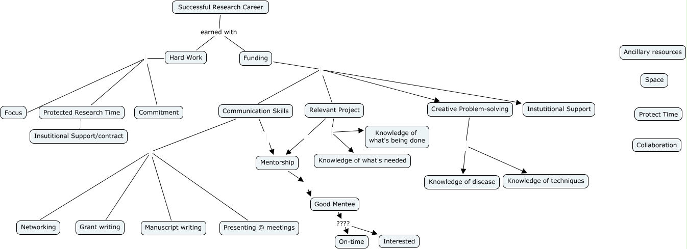 This Concept Map, created with IHMC CmapTools, has information related to: reeves map 1, Communication Skills Manuscript writing, Communication Skills Networking, Successful Research Career earned with Hard Work, Mentorship Good Mentee, Communication Skills Mentorship, Good Mentee ???? Interested, Good Mentee ???? On-time, Relevant Project Knowledge of what's being done, Protected Research Time Insutitional Support/contract, Relevant Project Mentorship, Creative Problem-solving Knowledge of disease, Hard Work Focus, Communication Skills Grant writing, Communication Skills Presenting @ meetings, Funding Communication Skills, Hard Work Commitment, Funding Instutitional Support, Relevant Project Knowledge of what's needed, Hard Work Protected Research Time, Creative Problem-solving Knowledge of techniques