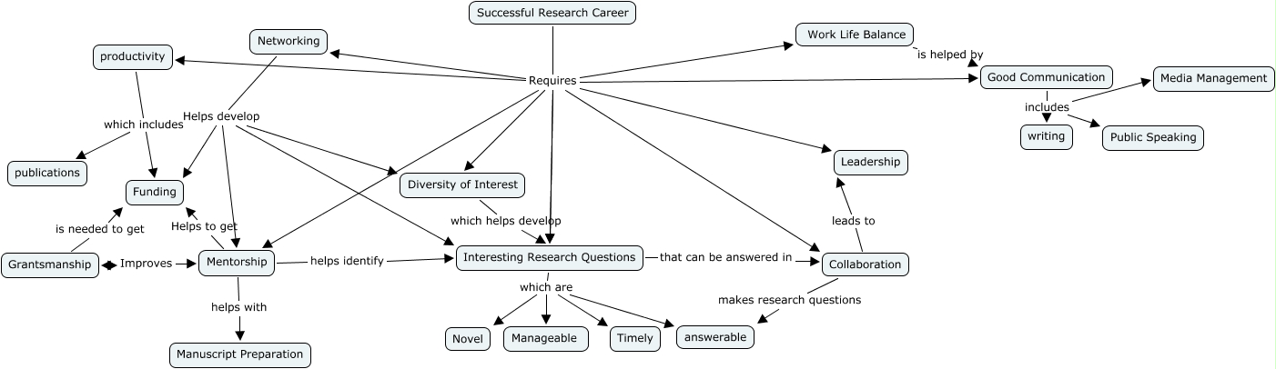 This Concept Map, created with IHMC CmapTools, has information related to: christoswanmap1, Interesting Research Questions which are answerable, Good Communication includes Media Management, Successful Research Career Requires Mentorship, productivity which includes publications, Successful Research Career Requires Diversity of Interest, Interesting Research Questions that can be answered in Collaboration, Successful Research Career Requires Collaboration, Networking Helps develop Diversity of Interest, Successful Research Career Requires Interesting Research Questions, Networking Helps develop Funding, Successful Research Career Requires Leadership, Good Communication includes Public Speaking, Interesting Research Questions which are Manageable, Networking Helps develop Mentorship, Successful Research Career Requires Good Communication, Work Life Balance is helped by Good Communication, Interesting Research Questions which are Novel, Successful Research Career Requires Interesting Research Questions, Diversity of Interest which helps develop Interesting Research Questions, Collaboration leads to Leadership