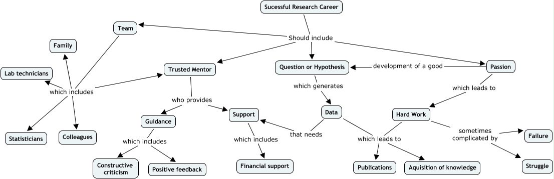 This Concept Map, created with IHMC CmapTools, has information related to: LindsayMap1RSucessfulResearchCareer, Data which leads to Publications, Sucessful Research Career Should include Question or Hypothesis, Team which includes Family, Hard Work which leads to Aquisition of knowledge, Data which leads to Aquisition of knowledge, Data that needs Support, Sucessful Research Career Should include Passion, Guidance which includes Constructive criticism, Sucessful Research Career Should include Team, Hard Work sometimes complicated by Struggle, Sucessful Research Career Should include Trusted Mentor, Guidance which includes Positive feedback, Hard Work which leads to Publications, Trusted Mentor who provides Support, Support which includes Financial support, Team which includes Colleagues, Team which includes Lab technicians, Team which includes Statisticians, Team which includes Trusted Mentor, Hard Work sometimes complicated by Failure