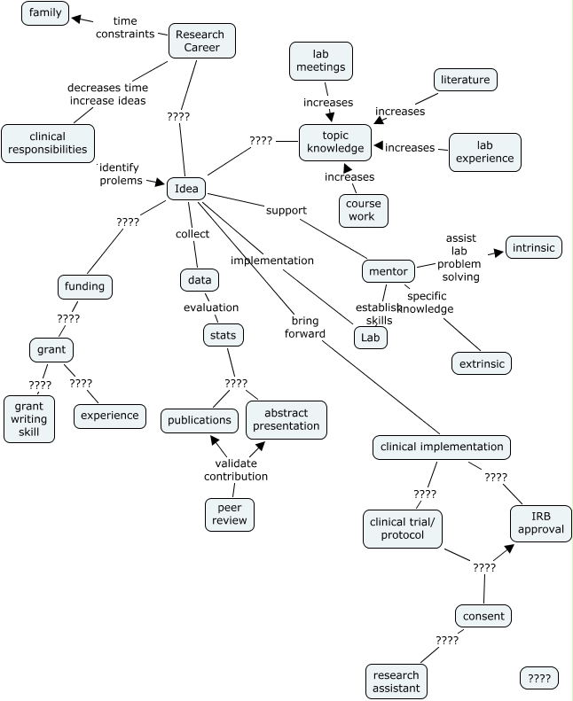 This Concept Map, created with IHMC CmapTools, has information related to: Stephanie Fritch Lilla, Research Career time constraints family, stats ???? abstract presentation, mentor establish skills Lab, Idea support mentor, clinical implementation ???? IRB approval, mentor specific knowledge extrinsic, funding ???? grant, course work increases topic knowledge, data evaluation stats, stats ???? publications, lab experience increases topic knowledge, Research Career decreases time increase ideas clinical responsibilities, mentor assist lab problem solving intrinsic, clinical trial/ protocol ???? IRB approval, Idea bring forward clinical implementation, grant ???? experience, Research Career ???? Idea, literature increases topic knowledge, clinical trial/ protocol ???? consent, clinical implementation ???? clinical trial/ protocol