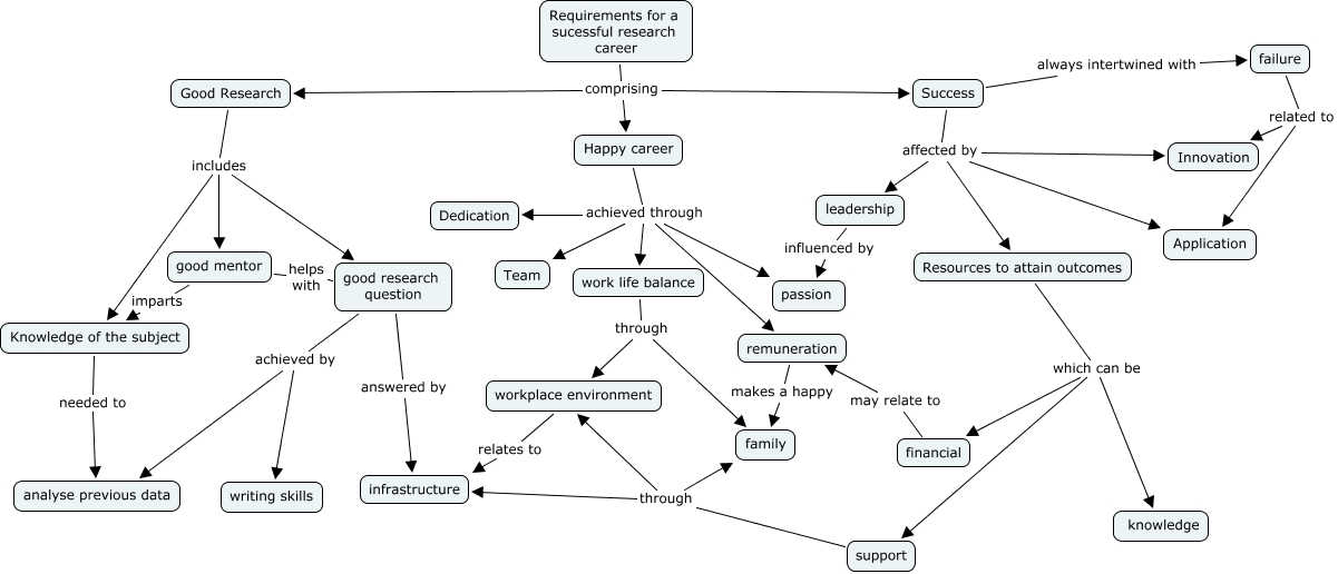 This Concept Map, created with IHMC CmapTools, has information related to: KhinchaMap1, Success affected by leadership, Good Research includes good research question, good research question answered by infrastructure, workplace environment relates to infrastructure, Happy career achieved through work life balance, Happy career achieved through Dedication, Happy career achieved through remuneration, good mentor imparts Knowledge of the subject, remuneration makes a happy family, failure related to Innovation, Requirements for a sucessful research career comprising Success, work life balance through family, Success always intertwined with failure, Requirements for a sucessful research career comprising Good Research, support through infrastructure, Resources to attain outcomes which can be financial, Requirements for a sucessful research career comprising Happy career, Knowledge of the subject needed to analyse previous data, Good Research includes good mentor, Happy career achieved through Team