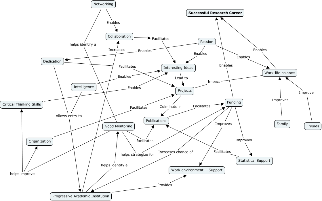This Concept Map, created with IHMC CmapTools, has information related to: RMukerjee Cmap1, Good Mentoring helps strategize for Funding, Progressive Academic Institution helps identify a Good Mentoring, Passion Enables Work-life balance, Projects Impact Work-life balance, Funding Enables Successful Research Career, Progressive Academic Institution Increases Collaboration, Good Mentoring facilitates Publications, Good Mentoring helps improve Organization, Statistical Support Facilitates Publications, Passion Enables Interesting Ideas, Networking Enables Collaboration, Dedication Facilitates Projects, Interesting Ideas Lead to Projects, Work-life balance Enables Successful Research Career, Family Improves Work-life balance, Passion Enables Dedication, Progressive Academic Institution Provides Work environment + Support, Intelligence Allows entry to Progressive Academic Institution, Friends Improve Work-life balance, Dedication Allows entry to Progressive Academic Institution
