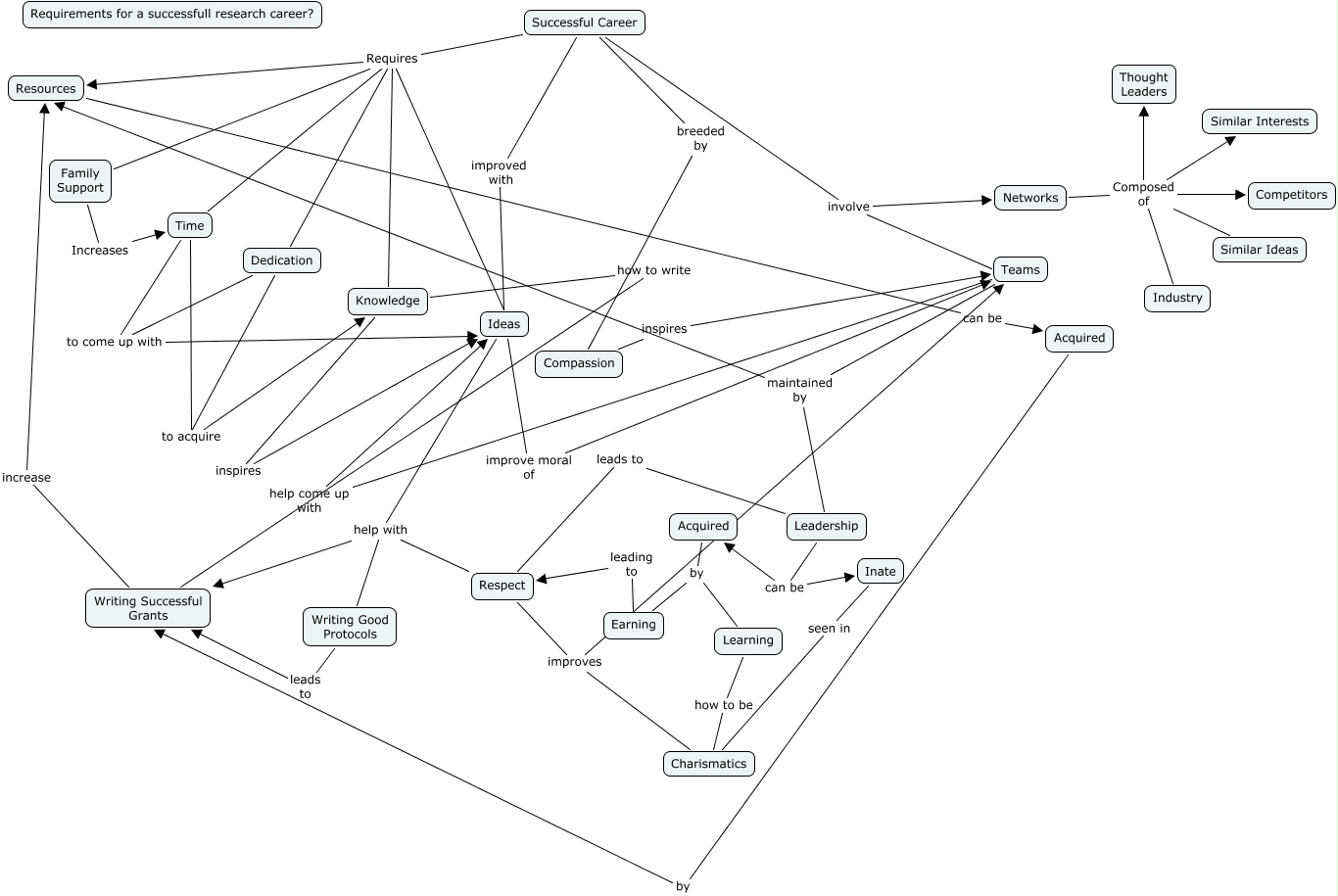This Concept Map, created with IHMC CmapTools, has information related to: HumdumDurraniMap1, Resources can be Acquired, Networks Composed of Industry, Teams maintained by Leadership, Time to acquire Knowledge, Writing Successful Grants increase Resources, Writing Good Protocols leads to Writing Successful Grants, Successful Career Requires Knowledge, Time to come up with Ideas, Dedication to acquire Knowledge, Successful Career Requires Ideas, Successful Career Requires Time, Respect improves Teams, Earning leading to Respect, Charismatics improves Teams, Leadership can be Acquired, Successful Career improved with Ideas, Successful Career involve Networks, Ideas help with Respect, Family Support Increases Time, Ideas improve moral of Teams