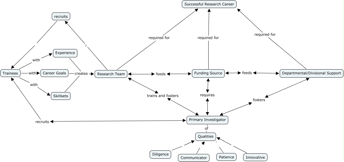 This Concept Map, created with IHMC CmapTools, has information related to: Dombrowski Map 1, Career Goals creates Research Team, Funding Source feeds Research Team, Primary Investigator recruits Trainees, Funding Source requires Primary Investigator, Trainees with Career Goals, Communicator Qualities, Research Team i recruits, Primary Investigator fosters Departmental/Divisional Support, Experience creates Research Team, Departmental/Divisional Support required for Successful Research Career, Skillsets creates Research Team, Funding Source required for Successful Research Career, Patience Qualities, Trainees with Skillsets, Research Team required for Successful Research Career, Funding Source feeds Departmental/Divisional Support, Qualities of Primary Investigator, recruits Trainees, Innovative Qualities, Primary Investigator trains and fosters Research Team