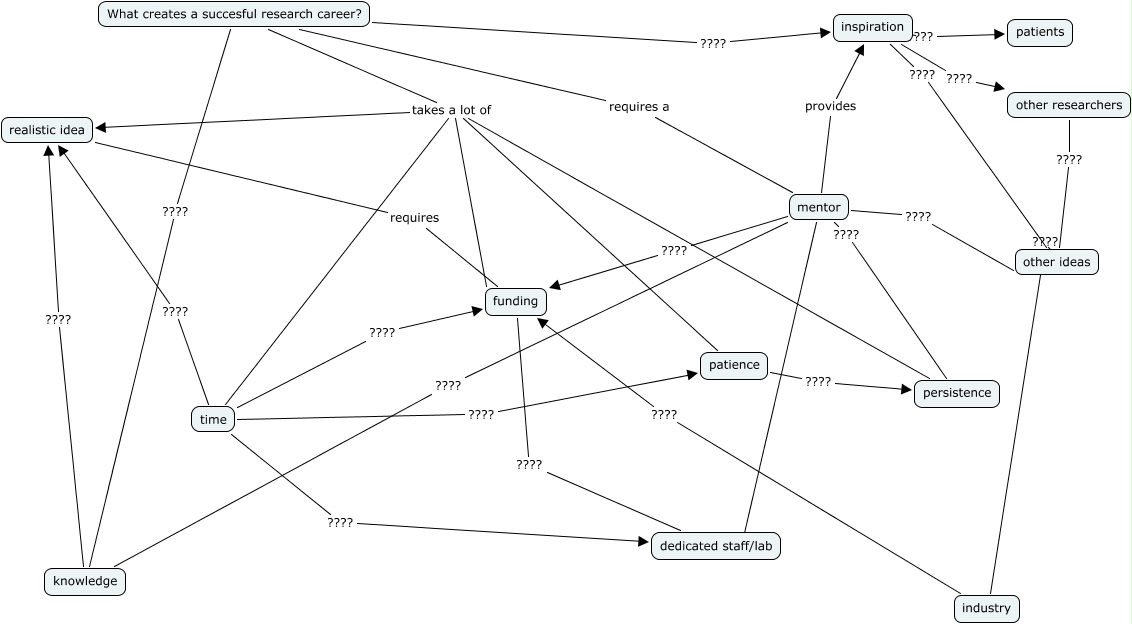 This Concept Map, created with IHMC CmapTools, has information related to: SaliniNaiduMap1, What creates a succesful research career? ???? knowledge, mentor ???? funding, What creates a succesful research career? takes a lot of time, funding ???? dedicated staff/lab, time ???? realistic idea, time ???? dedicated staff/lab, mentor provides inspiration, What creates a succesful research career? ???? inspiration, inspiration ???? patients, What creates a succesful research career? takes a lot of patience, mentor ???? other ideas, time ???? patience, other ideas ???? industry, What creates a succesful research career? takes a lot of persistence, industry ???? funding, realistic idea requires funding, mentor ???? persistence, time ???? funding, mentor ???? knowledge, other researchers ???? other ideas