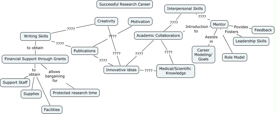 This Concept Map, created with IHMC CmapTools, has information related to: Research Career, Financial Support through Grants to obtain Support Staff, Mentor Povides Feedback, Medical/Scientific Knowledge ???? Innovative ideas, Creativity ???? Innovative ideas, Creativity ???? Writing Skills, Academic Collaborators ???? Innovative ideas, Financial Support through Grants allows bargaining for Protected research time, Financial Support through Grants to obtain Supplies, Writing Skills to obtain Financial Support through Grants, Interpersonal Skills ???? Mentor, Academic Collaborators ???? Medical/Scientific Knowledge, Motivation ???? Publications, Writing Skills ???? Publications, Mentor Introduction to Academic Collaborators, Mentor Role Model, Interpersonal Skills ???? Academic Collaborators, Innovative ideas ???? Publications, Financial Support through Grants to obtain Facilities, Mentor Fosters Leadership Skills, Mentor Assists in Career Modeling/ Goals