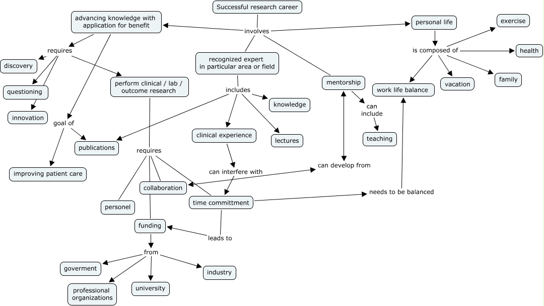 This Concept Map, created with IHMC CmapTools, has information related to: JeffreyClarkemap1, perform clinical / lab / outcome research requires funding, advancing knowledge with application for benefit requires perform clinical / lab / outcome research, perform clinical / lab / outcome research requires time committment, personal life is composed of health, recognized expert in particular area or field includes lectures, collaboration can develop from mentorship, clinical experience can interfere with time committment, personal life is composed of work life balance, time committment leads to funding, recognized expert in particular area or field includes clinical experience, Successful research career involves mentorship, perform clinical / lab / outcome research requires personel, funding from professional organizations, Successful research career involves recognized expert in particular area or field, mentorship can include teaching, funding from industry, personal life is composed of exercise, recognized expert in particular area or field includes publications, Successful research career involves advancing knowledge with application for benefit, funding from university