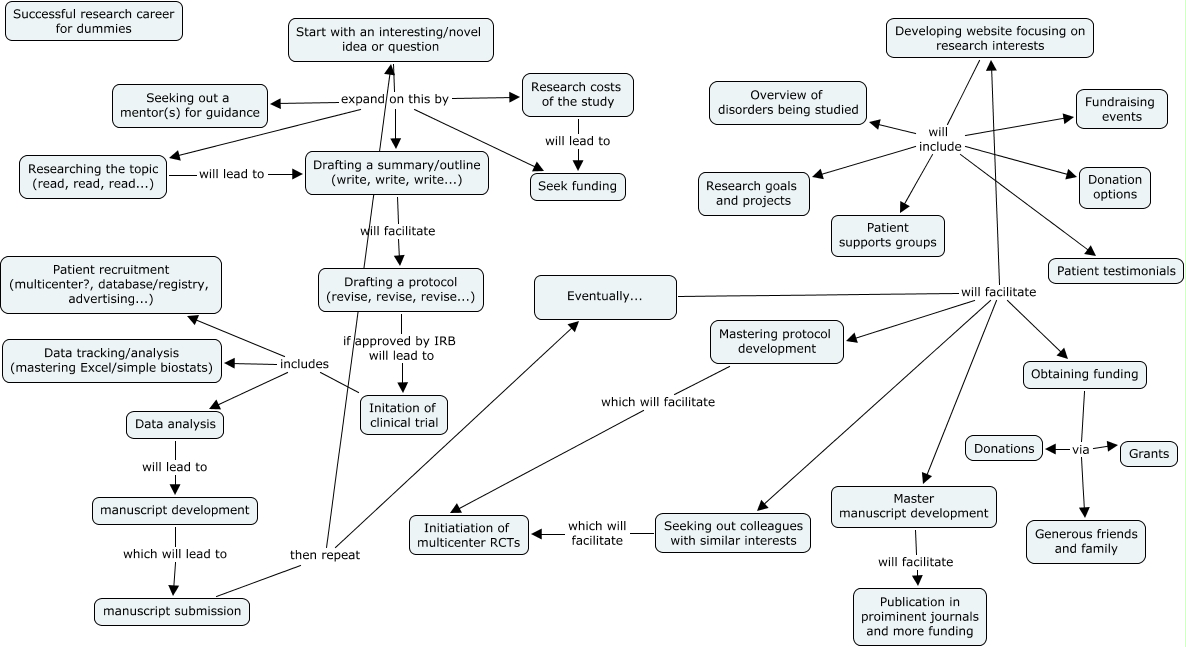 This Concept Map, created with IHMC CmapTools, has information related to: BL CMAP, manuscript development which will lead to manuscript submission, Obtaining funding via Generous friends and family, Initation of clinical trial includes Data analysis, Eventually... will facilitate Obtaining funding, Start with an interesting/novel idea or question expand on this by Seeking out a mentor(s) for guidance, Obtaining funding via Grants, Developing website focusing on research interests will include Research goals and projects, Drafting a protocol (revise, revise, revise...) if approved by IRB will lead to Initation of clinical trial, Eventually... will facilitate Master manuscript development, Initation of clinical trial includes Data tracking/analysis (mastering Excel/simple biostats), Developing website focusing on research interests will include Patient testimonials, Eventually... will facilitate Mastering protocol development, Data analysis will lead to manuscript development, Developing website focusing on research interests will include Fundraising events, Research costs of the study will lead to Seek funding, Eventually... will facilitate Seeking out colleagues with similar interests, Obtaining funding via Donations, Developing website focusing on research interests will include Overview of disorders being studied, Drafting a summary/outline (write, write, write...) will facilitate Drafting a protocol (revise, revise, revise...), manuscript submission then repeat Eventually...