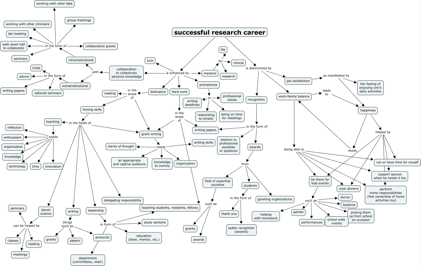 This Concept Map, created with IHMC CmapTools, has information related to: NiharikaMettuMap2, mentors for life, awards from students, grant writing needs clarity of thought, grant writing needs organization, be there for kids events such as dinner, successful research career is enhanced by mentors, extrainstitutional in the form of trials, teaching needs enthusiasm, intrainstitutional in the form of lab meeting, happiness helped by support spouse when he needs it too, promptness in professional duties, happiness helped by be there for kids events, be there for kids events such as helping with homework, leadership in form of teaching students, residents, fellows, honing skills in the fields of writing, hard work in the areas of teaching students, residents, fellows, promptness in responding to emails, leadership in form of education (dean, mentor, etc.), recognition in the form of awards, collaboration to collectively advance knowledge with intrainstitutional