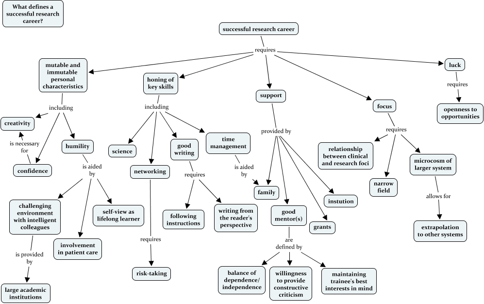 This Concept Map, created with IHMC CmapTools, has information related to: MichaelGrunwaldResearchCareer2, confidence is necessary for creativity, microcosm of larger system allows for extrapolation to other systems, successful research career requires focus, focus requires microcosm of larger system, humility is aided by involvement in patient care, networking requires risk-taking, honing of key skills including good writing, focus requires narrow field, challenging environment with intelligent colleagues is provided by large academic institutions, focus requires relationship between clinical and research foci, time management is aided by family, support provided by family, honing of key skills including networking, good writing requires following instructions, mutable and immutable personal characteristics including humility, successful research career requires luck, support provided by good mentor(s), luck requires openness to opportunities, good mentor(s) are defined by willingness to provide constructive criticism, humility is aided by challenging environment with intelligent colleagues