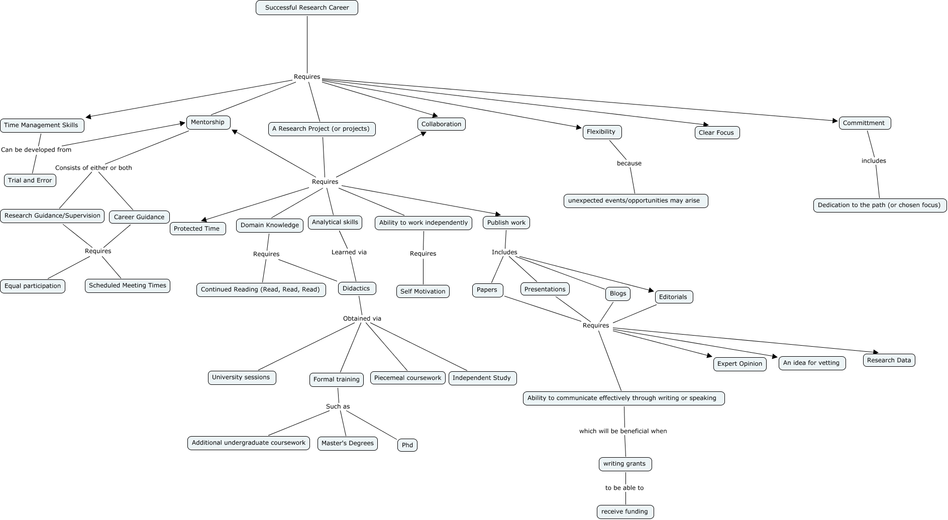 This Concept Map, created with IHMC CmapTools, has information related to: Successful Research Career_Post Course_Take 2, Analytical skills Learned via Didactics, Ability to work independently Requires Self Motivation, Presentations Requires Expert Opinion, Publish work Includes Presentations, Presentations Requires Ability to communicate effectively through writing or speaking, A Research Project (or projects) Requires Committment, A Research Project (or projects) Requires Collaboration, A Research Project (or projects) Requires Analytical skills, Editorials Requires An idea for vetting, Domain Knowledge Requires Mentorship, Flexibility because unexpected events/opportunities may arise, Successful Research Career Requires Flexibility, Successful Research Career Requires Time Management Skills, A Research Project (or projects) Requires Clear Focus, Didactics Obtained via University sessions, Publish work Includes Editorials, Research Guidance/Supervision Requires Equal participation, Successful Research Career Requires Committment, Time Management Skills Can be developed from Trial and Error, Domain Knowledge Requires Continued Reading (Read, Read, Read)