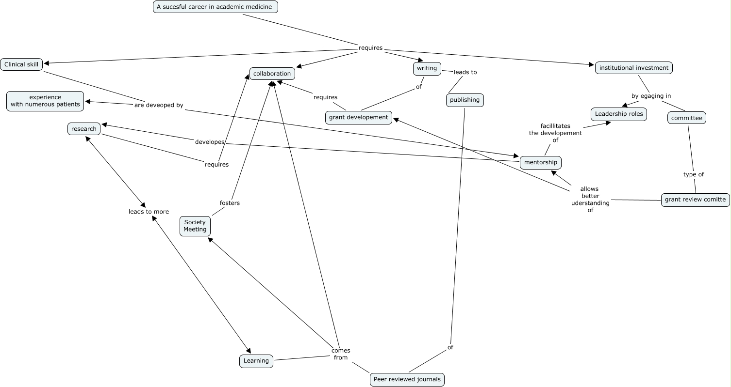 This Concept Map, created with IHMC CmapTools, has information related to: seankearinsuccessinacademics2, A sucesful career in academic medicine requires Clinical skill, research requires collaboration, grant review comitte allows better uderstanding of grant developement, A sucesful career in academic medicine requires institutional investment, mentorship developes research, institutional investment by egaging in Leadership roles, A sucesful career in academic medicine requires writing, Learning comes from collaboration, Clinical skill are deveoped by experience with numerous patients, mentorship facillitates the developement of Leadership roles, grant developement requires collaboration, A sucesful career in academic medicine requires collaboration, writing of grant developement, Learning leads to more research, Society Meeting fosters collaboration, grant review comitte allows better uderstanding of mentorship, writing leads to publishing, institutional investment by egaging in committee, committee type of grant review comitte, Learning comes from Peer reviewed journals