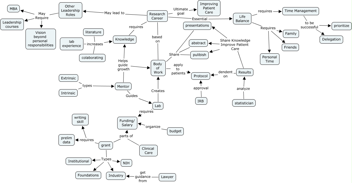This Concept Map, created with IHMC CmapTools, has information related to: Stephanie Fritch Lilla Take 2, grant Types Foundations, Mentor Helps guide growth Knowledge, IRB approval Protocol, Research Career requires Knowledge, pulibish Share Body of Work, Lab Creates Body of Work, Life Balance Requires Family, Lab requires Funding/ Salary, statistician analyze Results, Mentor Guides Lab, Other Leadership Roles May Require Leadership courses, abstract Share Body of Work, grant requires writing skill, Life Balance Requires Personal Time, Extrinsic types Mentor, Results dendent on Protocol, Mentor Helps guide growth Body of Work, grant parts of Funding/ Salary, Research Career Ultimate goal Improving Patient Care, lab experience increases Knowledge