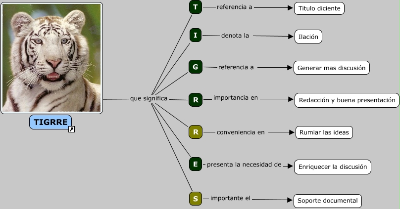 Este Cmap, tiene información relacionada con: tigrres.cmap, TIGRRES que significa T, TIGRRES que significa R, TIGRRES que significa I, I denota la Ilación, TIGRRES que significa G, TIGRRES que significa R, G referencia a Generar mas discusión, TIGRRES que significa S, R conveniencia en Rumiar las ideas, T referencia a Titulo diciente, E presenta la necesidad de Enriquecer la discusión, S importante el Soporte documental, R importancia en Redacción y buena presentación, TIGRRES que significa E, TIGRRE ????