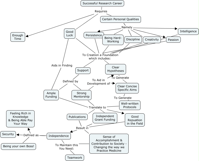 This Concept Map, created with IHMC CmapTools, has information related to: Successful Research Career 2, Being Hard- Working To Creation a Foundation which includes: Support, Creativity To Creation a Foundation which includes: Support, Intelligence To Creation a Foundation which includes: Support, Good Luck Aids in Finding Ample Funding, Strong Mentorship To Aid in Development of Clear Concise Specific Aims, Passion To Creation a Foundation which includes: Support, Strong Mentorship Translate to Publications, Creativity To Creation a Foundation which includes: Clear Hypotheses, Independence Defined as Feeling Rich in Knowledge & Being Able Pay Your Way, Certain Personal Qualities Namely Discipline, Strong Mentorship To Aid in Development of Clear Hypotheses, Independence Defined as Being your own Boss!, Certain Personal Qualities Namely Passion, Certain Personal Qualities Namely Intelligence, Good Repuation in the Field Result in Independence, Certain Personal Qualities Namely Persistence, Clear Concise Specific Aims To Generate Well-written Protocols, Well-written Protocols Translate to Publications, Being Hard- Working To Creation a Foundation which includes: Clear Hypotheses, Ample Funding Translate to Publications