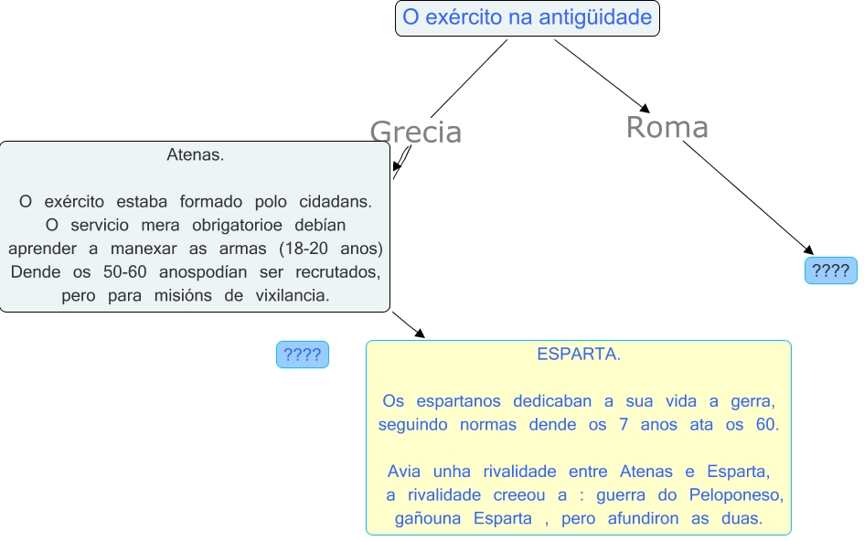 Este mapa conceptual ten información relativa a: Kevin_04, O exército na antigüidade Grecia ESPARTA. Os espartanos dedicaban a sua vida a gerra, seguindo normas dende os 7 anos ata os 60. Avia unha rivalidade entre Atenas e Esparta, a rivalidade creeou a : guerra do Peloponeso, gañouna Esparta , pero afundiron as duas., O exército na antigüidade Roma ????, O exército na antigüidade Grecia Atenas. O exército estaba formado polo cidadans. O servicio mera obrigatorioe debían aprender a manexar as armas (18-20 anos) Dende os 50-60 anospodían ser recrutados, pero para misións de vixilancia.