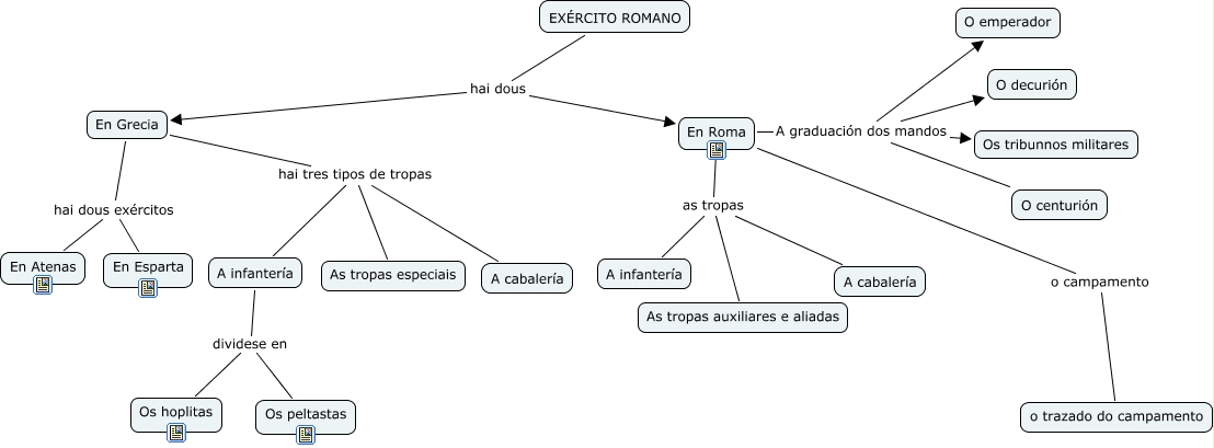 Este mapa conceptual ten información relativa a: adara_04, En Grecia hai tres tipos de tropas A cabalería, En Roma A graduación dos mandos O emperador, En Roma o campamento o trazado do campamento, A infantería dividese en Os peltastas, A infantería dividese en Os hoplitas, EXÉRCITO ROMANO hai dous En Roma, En Roma as tropas As tropas auxiliares e aliadas, En Grecia hai dous exércitos En Atenas, En Grecia hai tres tipos de tropas As tropas especiais, En Grecia hai dous exércitos En Esparta, En Roma A graduación dos mandos O centurión, En Roma as tropas A infantería, En Roma A graduación dos mandos Os tribunnos militares, En Roma as tropas A cabalería, En Roma A graduación dos mandos O decurión, En Grecia hai tres tipos de tropas A infantería, EXÉRCITO ROMANO hai dous En Grecia