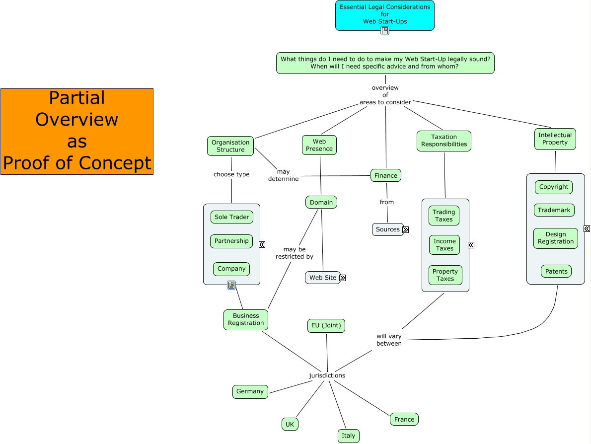 This Concept Map, created with IHMC CmapTools, has information related to: Web Entrepreneur Legal Knowledge Base, Organisation Structure choose type Legal Entity, What things do I need to do to make my Web Start-Up legally sound? When will I need specific advice and from whom? overview of areas to consider Taxation Responsibilities, Business Registration jurisdictions will vary between, Business Registration jurisdictions EU (Joint), Business Registration jurisdictions France, Legal Entity may affect Business Registration, will vary between ????, Finance from Sources, Business Registration jurisdictions Italy, Business Registration jurisdictions UK, What things do I need to do to make my Web Start-Up legally sound? When will I need specific advice and from whom? overview of areas to consider Finance, What things do I need to do to make my Web Start-Up legally sound? When will I need specific advice and from whom? overview of areas to consider Web Presence, Intellectual Property ????, Domain may be restricted by Business Registration, Business Registration jurisdictions Germany, Taxation Responsibilities ????, Web Presence Domain, What things do I need to do to make my Web Start-Up legally sound? When will I need specific advice and from whom? overview of areas to consider Intellectual Property, Finance may determine Organisation Structure, Domain Web Site