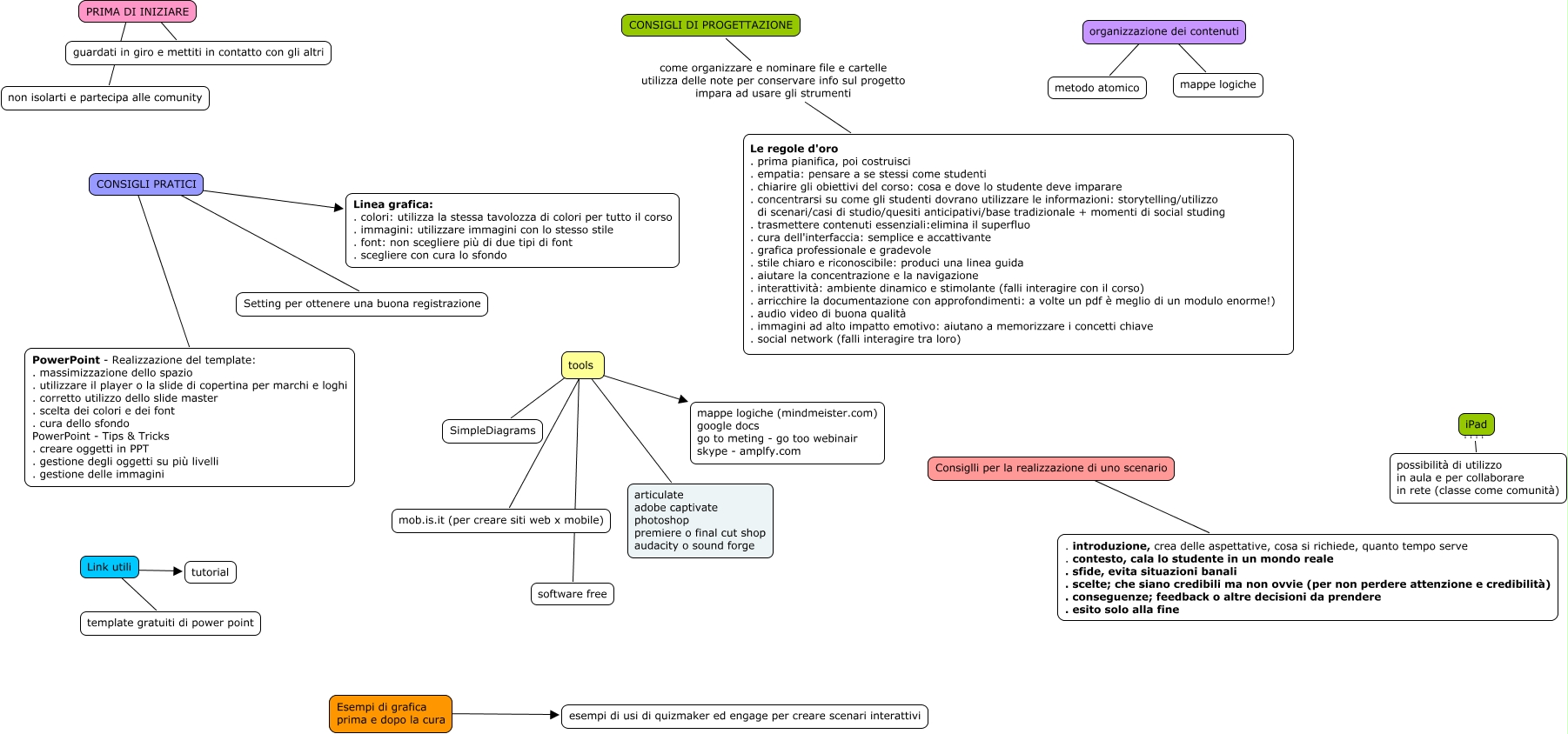 Questa Cmap, creata con IHMC CmapTools, contiene informazioni relative a: Corso docenti Beep 2, possibilità di utilizzo in aula e per collaborare in rete (classe come comunità) ???? iPad, tools ???? SimpleDiagrams, CONSIGLI DI PROGETTAZIONE come organizzare e nominare file e cartelle utilizza delle note per conservare info sul progetto impara ad usare gli strumenti Le regole d'oro . prima pianifica, poi costruisci . empatia: pensare a se stessi come studenti . chiarire gli obiettivi del corso: cosa e dove lo studente deve imparare . concentrarsi su come gli studenti dovrano utilizzare le informazioni: storytelling/utilizzo di scenari/casi di studio/quesiti anticipativi/base tradizionale + momenti di social studing . trasmettere contenuti essenziali:elimina il superfluo . cura dell'interfaccia: semplice e accattivante . grafica professionale e gradevole . stile chiaro e riconoscibile: produci una linea guida . aiutare la concentrazione e la navigazione . interattività: ambiente dinamico e stimolante (falli interagire con il corso) . arricchire la documentazione con approfondimenti: a volte un pdf è meglio di un modulo enorme!) . audio video di buona qualità . immagini ad alto impatto emotivo: aiutano a memorizzare i concetti chiave . social network (falli interagire tra loro), organizzazione dei contenuti ???? metodo atomico, tools ???? mappe logiche (mindmeister.com) google docs go to meting - go too webinair skype - amplfy.com, PRIMA DI INIZIARE ???? non isolarti e partecipa alle comunity, Link utili ???? tutorial, Consiglli per la realizzazione di uno scenario ???? . introduzione, crea delle aspettative, cosa si richiede, quanto tempo serve . contesto, cala lo studente in un mondo reale . sfide, evita situazioni banali . scelte; che siano credibili ma non ovvie (per non perdere attenzione e credibilità) . conseguenze; feedback o altre decisioni da prendere . esito solo alla fine, CONSIGLI PRATICI ???? Linea grafica: . colori: utilizza la stessa tavolozza di colori per tutto il corso . immagini: utilizzare immagini con lo stesso stile . font: non scegliere più di due tipi di font . scegliere con cura lo sfondo, organizzazione dei contenuti ???? mappe logiche, CONSIGLI PRATICI ???? PowerPoint - Realizzazione del template: . massimizzazione dello spazio . utilizzare il player o la slide di copertina per marchi e loghi . corretto utilizzo dello slide master . scelta dei colori e dei font . cura dello sfondo PowerPoint - Tips & Tricks . creare oggetti in PPT . gestione degli oggetti su più livelli . gestione delle immagini, Link utili ???? template gratuiti di power point, CONSIGLI PRATICI ???? Setting per ottenere una buona registrazione, tools ???? mob.is.it (per creare siti web x mobile), tools ???? articulate adobe captivate photoshop premiere o final cut shop audacity o sound forge, PRIMA DI INIZIARE ???? guardati in giro e mettiti in contatto con gli altri, Esempi di grafica prima e dopo la cura ???? esempi di usi di quizmaker ed engage per creare scenari interattivi, tools ???? software free