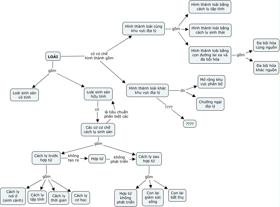This Concept Map, created with IHMC CmapTools, has information related to: DH-evo-speciation, Cách ly trước hợp tử gồm Cách ly nơi ở (sinh cảnh), LOÀI gồm Loài sinh sản hữu tính, Hình thành loài cùng khu vực địa lý gồm Hình thành loài bằng cách ly tập tính, Cách ly sau hợp tử gồm Con lai giảm sức sống, Hợp tử không phát triển Cách ly sau hợp tử, Hình thành loài khác khu vực địa lý ???? ????, Hình thành loài khác khu vực địa lý do Chướng ngại địa lý, Hình thành loài bằng con đường lai xa và đa bội hóa gồm Đa bội hóa khác nguồn, Cách ly trước hợp tử gồm Cách ly tập tính, LOÀI có cơ chế hình thành gồm Hình thành loài khác khu vực địa lý, Các cơ cơ chế cách ly sinh sản gồm Cách ly sau hợp tử, Cách ly trước hợp tử gồm Cách ly thời gian, LOÀI gồm Loài sinh sản vô tính, Các cơ cơ chế cách ly sinh sản gồm Cách ly trước hợp tử, Hình thành loài khác khu vực địa lý do Mở rộng khu vực phân bố, Cách ly sau hợp tử gồm Con lai bất thụ, Cách ly trước hợp tử gồm Cách ly cơ học, Cách ly trước hợp tử không tạo ra Hợp tử, LOÀI có cơ chế hình thành gồm Hình thành loài cùng khu vực địa lý, Hình thành loài cùng khu vực địa lý gồm Hình thành loài bằng cách ly sinh thái