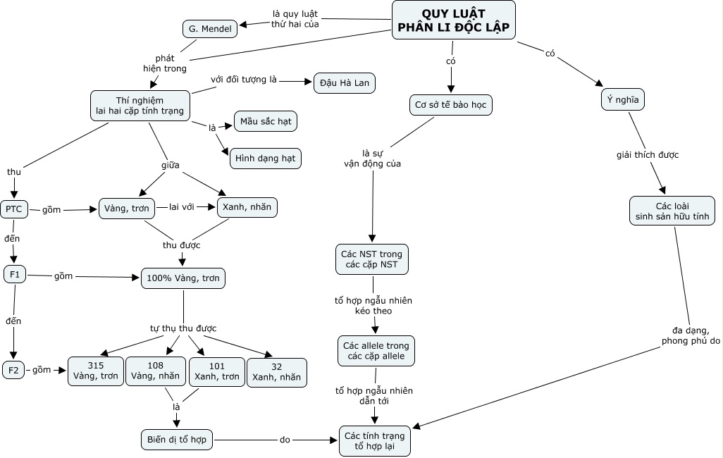 This Concept Map, created with IHMC CmapTools, has information related to: 12-9-PHANLYDOCLAP, 100% Vàng, trơn tự thụ thu được 101 Xanh, trơn, Thí nghiệm lai hai cặp tính trạng giữa Vàng, trơn, Ý nghĩa giải thích được Các loài sinh sản hữu tính, Thí nghiệm lai hai cặp tính trạng giữa Xanh, nhăn, Cơ sở tế bào học là sự vận động của Các NST trong các cặp NST, 100% Vàng, trơn tự thụ thu được 315 Vàng, trơn, Biến dị tổ hợp do Các tính trạng tổ hợp lại, Các loài sinh sản hữu tính đa dạng, phong phú do Các tính trạng tổ hợp lại, Thí nghiệm lai hai cặp tính trạng với đối tượng là Đậu Hà Lan, 100% Vàng, trơn tự thụ thu được 108 Vàng, nhăn, QUY LUẬT PHÂN LI ĐỘC LẬP phát hiện trong Thí nghiệm lai hai cặp tính trạng, PTC đến F1, Vàng, trơn thu được 100% Vàng, trơn, 100% Vàng, trơn tự thụ thu được 32 Xanh, nhăn, G. Mendel phát hiện trong Thí nghiệm lai hai cặp tính trạng, Các allele trong các cặp allele tổ hợp ngẫu nhiên dẫn tới Các tính trạng tổ hợp lại, Thí nghiệm lai hai cặp tính trạng thu PTC, F1 đến F2, 108 Vàng, nhăn là Biến dị tổ hợp, QUY LUẬT PHÂN LI ĐỘC LẬP có Cơ sở tế bào học