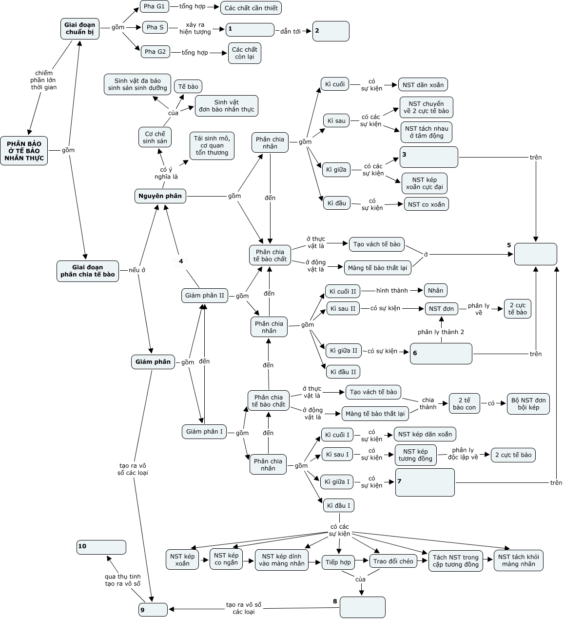 This Concept Map, created with IHMC CmapTools, has information related to: DH-gen-Cellular cycle-form, Phân chia nhân gồm Kì giữa I, Kì sau có các sự kiện NST tách nhau ở tâm động, Phân chia nhân đến Phân chia tế bào chất, Phân chia nhân gồm Kì đầu II, Nguyên phân có ý nghĩa là Cơ chế sinh sản, Giảm phân tạo ra vô số các loại Giao tử, Nguyên phân gồm Phân chia nhân, Nguyên phân có ý nghĩa là Tái sinh mô, cơ quan tổn thương, Giảm phân gồm Giảm phân I, PHÂN BÀO Ở TẾ BÀO NHÂN THỰC gồm Giai đoạn phân chia tế bào, Kì đầu I có các sự kiện NST kép dính vào màng nhân, Kì đầu I có các sự kiện NST kép xoắn, Phân chia nhân gồm Kì sau I, Tiếp hợp của Cặp NST kép tương đồng, Cặp NST kép tương đồng tạo ra vô số các loại Giao tử, Trao đổi chéo ???? Tách NST trong cặp tương đồng, Tiếp hợp ???? Trao đổi chéo, Giai đoạn phân chia tế bào nếu ở Nguyên phân, Tạo vách tế bào ở Mặt phẳng xích đạo, Kì giữa I có sự kiện Các cặp NST kép tập trung thành 2 hàng