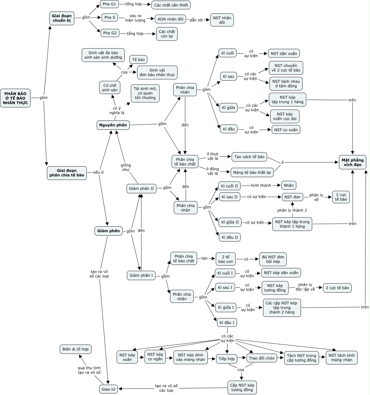 This Concept Map, created with IHMC CmapTools, has information related to: DH-gen-Cellular cycle, Phân chia nhân gồm Kì giữa I, Kì sau có các sự kiện NST tách nhau ở tâm động, Phân chia nhân gồm Kì đầu II, Nguyên phân có ý nghĩa là Cơ chế sinh sản, Giảm phân tạo ra vô số các loại Giao tử, Nguyên phân gồm Phân chia nhân, Nguyên phân có ý nghĩa là Tái sinh mô, cơ quan tổn thương, Giảm phân gồm Giảm phân I, PHÂN BÀO Ở TẾ BÀO NHÂN THỰC gồm Giai đoạn phân chia tế bào, Tạo vách tế bào ở Mặt phẳng xích đạo, Kì đầu I có các sự kiện NST kép dính vào màng nhân, Kì đầu I có các sự kiện NST kép xoắn, Phân chia nhân gồm Kì sau I, Tiếp hợp của Cặp NST kép tương đồng, Cặp NST kép tương đồng tạo ra vô số các loại Giao tử, Trao đổi chéo ???? Tách NST trong cặp tương đồng, Tiếp hợp ???? Trao đổi chéo, Giai đoạn phân chia tế bào nếu ở Nguyên phân, Kì giữa I có sự kiện Các cặp NST kép tập trung thành 2 hàng, Phân chia nhân gồm Kì cuối