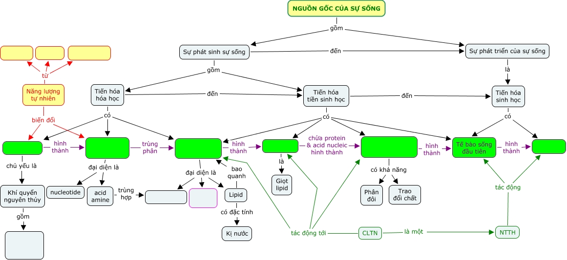 This Concept Map, created with IHMC CmapTools, has information related to: b1, Tiến hóa hóa học có Các đại phân tử hữu cơ, Tiến hóa tiền sinh học có Liposome, Năng lượng tự nhiên biến đổi Chất vô cơ, NGUỒN GỐC CỦA SỰ SỐNG gồm Sự phát triển của sự sống, Lipid có đặc tính Kị nước, Chất hữu cơ đơn giản đại diện là acid amine, Protobiont (Tế bào sơ khai) hình thành Tế bào sống đầu tiên, Năng lượng tự nhiên từ Núi lửa, Các đại phân tử hữu cơ đại diện là Lipid, acid amine trùng hợp Polypeptide, Khí quyển nguyên thủy gồm CH4, NH3, H2, hơi nước, ..., Tế bào sống đầu tiên hình thành Sinh giới, Sự phát sinh sự sống gồm Tiến hóa hóa học, Sự phát sinh sự sống đến Sự phát triển của sự sống, Protobiont (Tế bào sơ khai) có khả năng Phân đôi, CLTN tác động tới Protobiont (Tế bào sơ khai), Tiến hóa tiền sinh học có Tế bào sống đầu tiên, Năng lượng tự nhiên từ Tia tử ngoại, Tiến hóa hóa học có Chất vô cơ, Tiến hóa sinh học có Sinh giới
