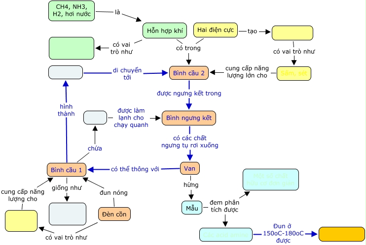 This Concept Map, created with IHMC CmapTools, has information related to: b2, Van có thể thông với Bình cầu 1, Mẫu đem phân tích được Các acid amine, Bình ngưng kết có các chất ngưng tụ rơi xuống Van, tia lửa điện có vai trò như Sấm, sét, Đèn cồn có vai trò như Núi lửa, mặt trời, Mẫu đem phân tích được Một số chất hữu cơ đơn giản, Hai điện cực tạo tia lửa điện, Đèn cồn đun nóng Bình cầu 1, Hỗn hợp khí có vai trò như Khí quyển nguyên thủy, Các acid amine Đun ở 150oC-180oC được Protein nhiệt, CH4, NH3, H2, hơi nước là Hỗn hợp khí, Van hứng Mẫu, Sấm, sét cung cấp năng lượng lớn cho Bình cầu 2, Hai điện cực có trong Bình cầu 2, Hơi nước di chuyển tới Bình cầu 2, Bình cầu 1 giống như Biển, đại dương, Hỗn hợp khí có trong Bình cầu 2, Bình cầu 2 được ngưng kết trong Bình ngưng kết, Núi lửa, mặt trời cung cấp năng lượng cho Bình cầu 1, Bình cầu 1 hình thành Hơi nước