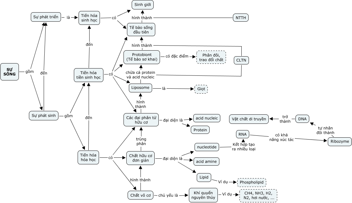 This Concept Map, created with IHMC CmapTools, has information related to: 32-The origin of life-new, Tiến hóa hóa học có Các đại phân tử hữu cơ, Ribozyme tự nhân đôi thành DNA, Tiến hóa tiền sinh học có Liposome, Các đại phân tử hữu cơ đại diện là Protein, RNA có khả năng xúc tác Ribozyme, SỰ SỐNG gồm Sự phát triển, CLTN chứa cả protein và acid nucleic Protobiont (Tế bào sơ khai), nucleotide Kết hợp tạo ra nhiều loại RNA, Các đại phân tử hữu cơ đại diện là acid nucleic, Chất hữu cơ đơn giản đại diện là acid amine, DNA trở thành Vật chất di truyền, Protobiont (Tế bào sơ khai) hình thành Tế bào sống đầu tiên, Khí quyển nguyên thủy Ví dụ CH4, NH3, H2, N2, hơi nước, ..., Tế bào sống đầu tiên hình thành Sinh giới, Sự phát sinh đến Sự phát triển, NTTH hình thành Sinh giới, Sự phát sinh gồm Tiến hóa hóa học, Protobiont (Tế bào sơ khai) có đặc điểm Phân đôi, trao đổi chất, Tiến hóa tiền sinh học có Tế bào sống đầu tiên, Tiến hóa sinh học có Sinh giới