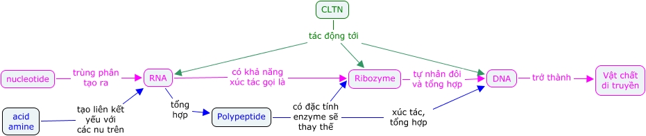 This Concept Map, created with IHMC CmapTools, has information related to: Copy of b3, xúc tác, tổng hợp ???? DNA, nucleotide trùng phân tạo ra RNA, CLTN tác động tới DNA, CLTN tác động tới RNA, Ribozyme tự nhân đôi và tổng hợp DNA, RNA tổng hợp Polypeptide, acid amine tạo liên kết yếu với các nu trên RNA, DNA trở thành Vật chất di truyền, Polypeptide có đặc tính enzyme sẽ thay thế Ribozyme, CLTN tác động tới Ribozyme, Polypeptide có đặc tính enzyme sẽ thay thế xúc tác, tổng hợp, RNA có khả năng xúc tác gọi là Ribozyme