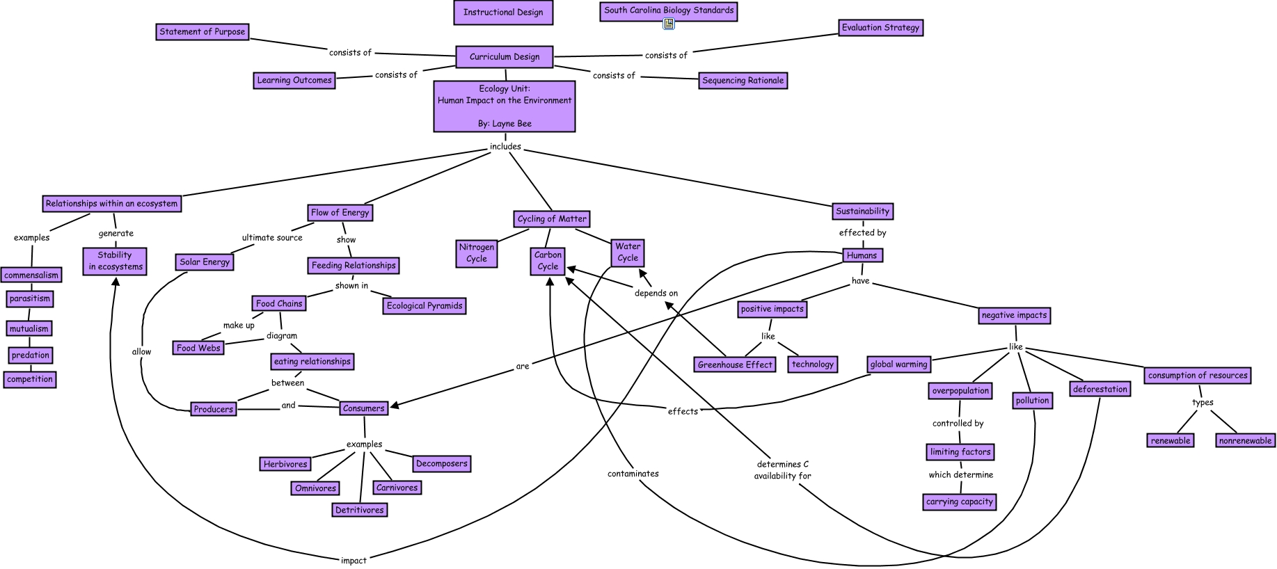 This Concept Map, created with IHMC CmapTools, has information related to: LBee_Curriculum Design & Map Project, Consumers examples Omnivores, Solar Energy allow Producers, Cycling of Matter ???? Nitrogen Cycle, negative impacts like pollution, Curriculum Design consists of Statement of Purpose, Consumers examples Herbivores, Sustainability effected by Humans, parasitism ???? mutualism, commensalism ???? parasitism, Ecology Unit: Human Impact on the Environment By: Layne Bee includes Sustainability, negative impacts like overpopulation, eating relationships between Consumers, Curriculum Design consists of Sequencing Rationale, Ecology Unit: Human Impact on the Environment By: Layne Bee includes Cycling of Matter, Flow of Energy ultimate source Solar Energy, Feeding Relationships shown in Ecological Pyramids, consumption of resources types nonrenewable, negative impacts like deforestation, Feeding Relationships shown in Food Chains, Humans have positive impacts